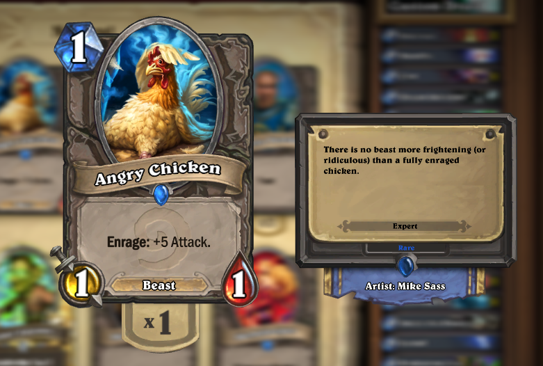 But what I have described so far seems pretty standard to a collectible card game. What makes Hearthstone stand out is its incredible graphics, awesome sound effects, and other extra stuff that makes it more than just the usual card game. First off, each card has amazing graphics that makes it a piece of art. In fact, right-clicking on each card in the collection reveals the name of the artist who drew the graphics along with a quote that is related to the name of the card, and which is generally worth a read. There are also many allusions to legends in the Warcraft world. One particular example is the card Leeroy Jenkins, named after the legendary WOW player. As each minion is played, there is an accompanying sound effect from another Warcraft game.