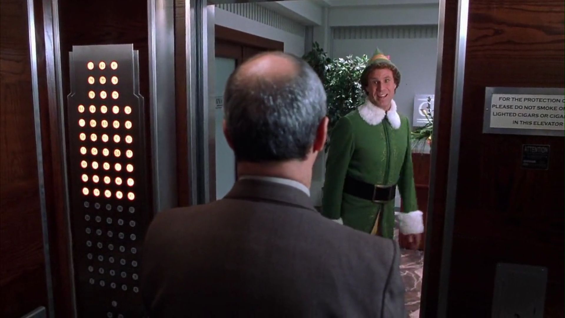 There is a scene early on in the film where Buddy is taking an elevator to Walter’s office for the first time. He strikes up a one-way conversation with a clearly unenthusiastic stranger for the entire ride up. Buddy reaches his floor, steps out and the doors begin to close. Right before they close completely, he frantically turns around and shouts to the stranger “I forgot to give you a hug!”