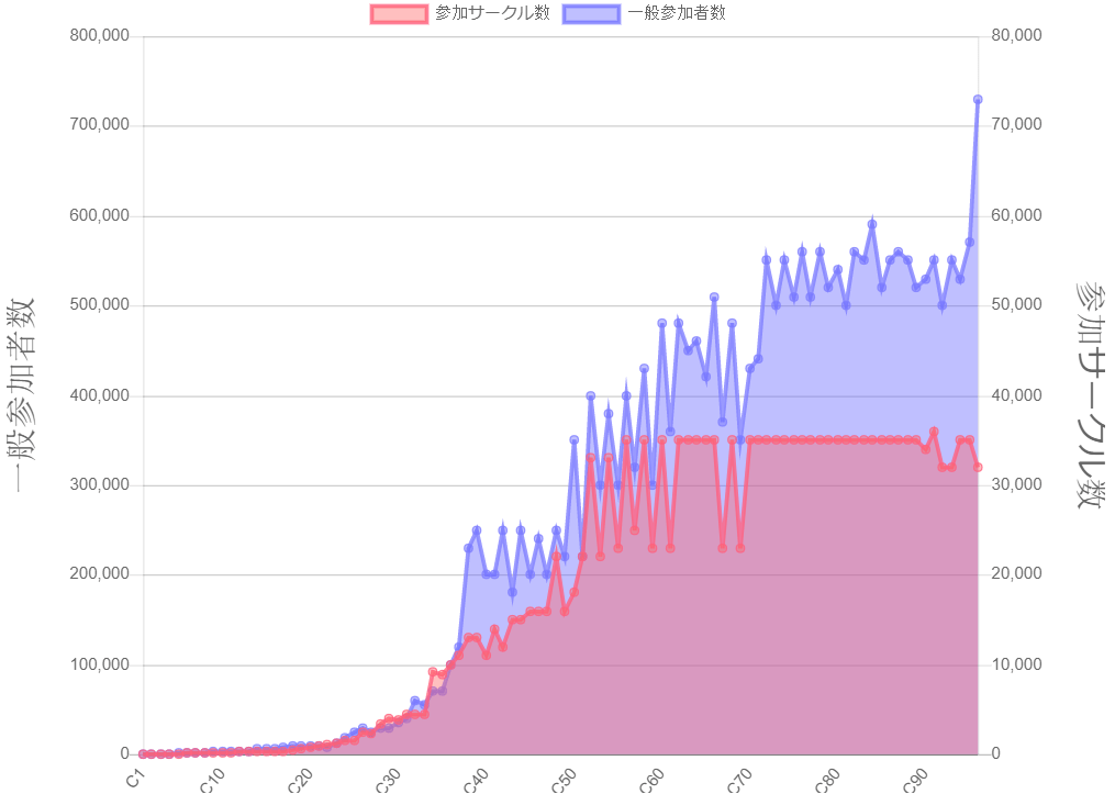 and Number of Circles (In Red) from Comiket 1 to Comiket 96