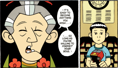 The transformation in this graphic novel is a more spiritual one because Jin, and later the Monkey King’s Son, want to transform into the ideal American. The Monkey King’s son transforms himself when he enters this world and takes the form of a stereotypical nerdy Chinese male teen and the boy Jin transforms into a Caucasian teen (Yang, 194). Jin is under the impression that to be American is an aesthetic-based determinant instead of the social-construct it is supposed to be. One must look some way and act some way to really be part of America.