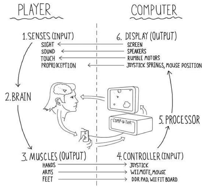 The act of playing a computer game can be seen as an interactive process. Interactivity, according to media scholar Lori Landay, is “an action that occurs as two or more participants exchange information that has a reciprocal effect on the other”. Perhaps game developer Steve Swink’s model of the computer-player nexus belays the best example of this definition. In his player-game apparatus, users perceive icons from the game through their sensory organs, process and ‘solve’ these prompts via their brains, and respond through actions inputted into their controller. On the reciprocal end, the game console receives these actions through the control scheme, interprets them through the processor, and outputs visual and auditory information back to the user.
