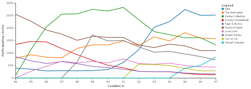 Aside from that, doujin music and doujin games further deepen and expand a game’s story. Doujin artists imagine, speculate, theorize, and try to explain the canon plotline, and turn those ideas into completed work and bring them to the table. Over time, the number of circles grew rapidly from 7 in 2003 to 2272 in Comiket 85, 2013, and took the leads for a long time before being surpassed by Kantai Collection at Comiket 86.