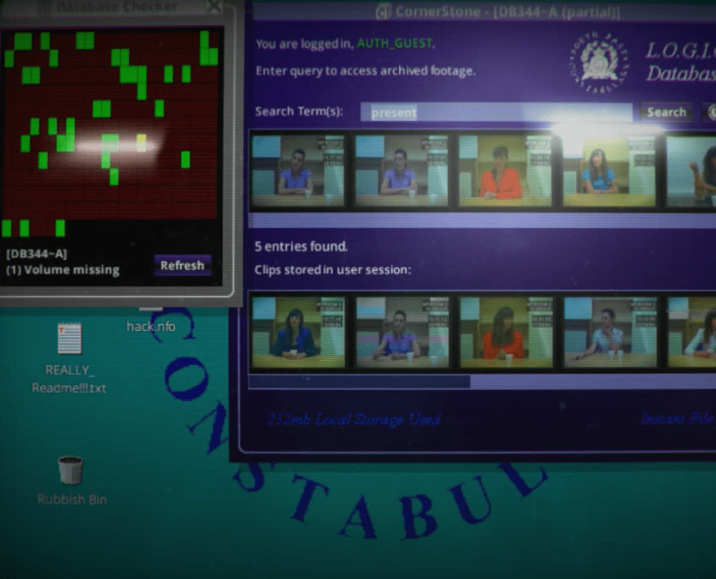 As a brief summary, Her Story is an interactive game where the player begins with gaining access to a police database of the investigation records of a woman, and the goal is to uncover the story, or the truth. As the player watches more videos, they learn more about the situation, can use keywords to explore more, and soon learn more about their role as the player, too.