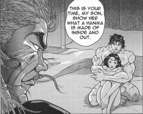After sleeping with his girlfriend, Baki begins to change in how he is perceived by his opponents and the other men. They literally state how he seems to have grown, matured, or become a man now, as if they can just tell that Baki is no longer a virgin; as if being a virgin was holding him back as a fighter or man. Baki even begins to neglect his girlfriend, pushing her away in his pursuits of strength. This may be the point where Baki has accepted the toxic propaganda of being a “man” in his fathers eyes and throwing away everything else.