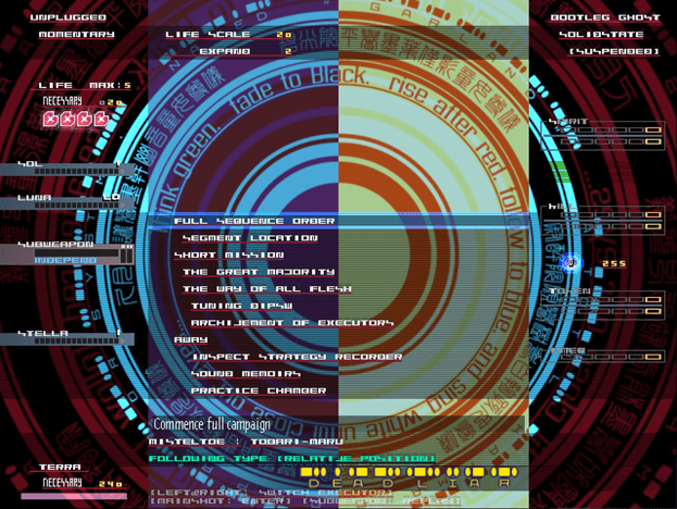 And while the music is very clearly dated and not as professional, that’s one of the points that makes it so… doujin. The early trance style and the irregular writing in tandem with the visuals of the game conjure up images of notable surreal Japanese culture surrounding other shmups like Treasure’s Radiant Silvergun, rhythm games such as BMS (Lunatic Rave 2), or other similarly surreal and abstract anime culture (think Akira?). It provides a real insight into the universes that can be created within a single mind.