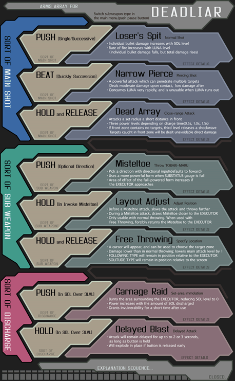 However, Hellsinker. is far from conventional in its controls; while Touhou and many other well known games only make use of 3 buttons with no special combinations, each of Hellsinker.’s characters has a wide array of attacks and moves activated by combining, holding, or tapping buttons; all of which will prove useful in clearing the game. As well, there are 7 different character setups available for the player, each providing vastly different playstyles and weapon usages.