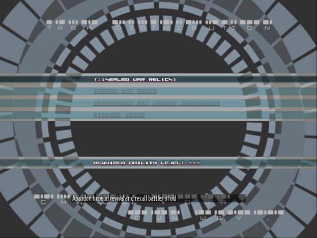 This game pulls no punches when it comes to sinking the player into a cryptic, surreal, and at times psychedelic world. As mentioned earlier, the player is immediately given the image of a mechanical and abandoned world through the stage backgrounds and giant mecha-like bosses. Special attention is paid to the graphic design of the text and UI, most notably found in the use of a completely original font that emphasizes a sharp and blocky texture that is simultaneously unsettling. There is also an inexplicable obsession with the use of Morse code, present from the main menu to the boss warning sirens to the game over screen. A far-future world, broken and electronic, is evoked through the exposition; what secrets can you, the cyborg rejects, discover in the Cardinal Shaft, the imposing relic of the past?