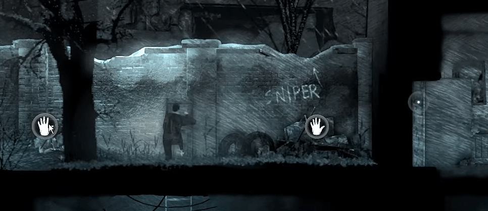 Unlike in popular war games where the players side with the military, This War of Mine focuses on the lives of civilians who are just trying to survive. Many have backstories no different to people around us: music student, firefighter, lawyer, handyman, and child. The setting is inspired by the Siege of Sarajevo, a real horrendous event that took place from 1992–1996, where civilians were trapped in the city with limited supplies, and had to find ways to survive under assault from the military. This War of Mine included a playable map location named “Sniper Junction” inspired by the famous “Sniper Alley,” where many sniper posts were set for geographical advantages. Crossing the city to scavenge and survive, civilians allegedly either ran past or followed United Nations vehicles that functioned as shields. Warning signs that were painted by civilians for other civilians can also be seen in the game. Alongside the scenery of crumbling walls and furniture ruins, the developer does a great job of simulating the dystopian nature of war for players who are used to peaceful daily lives.