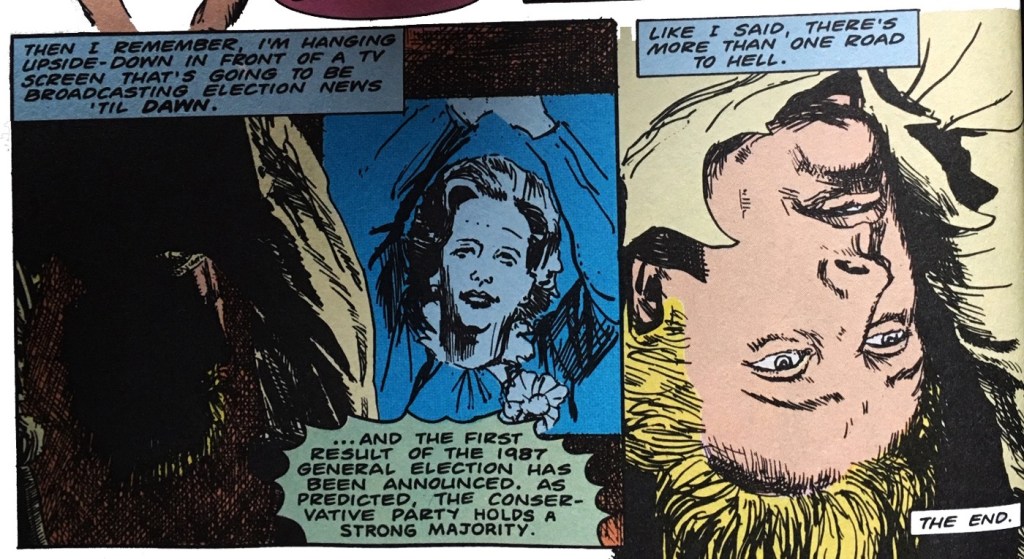 “The Bogeyman” and “Dead Boy’s Heart” are two of the great achievements of Delano’s run on the character, assessing Constantine as a man driven by, more than anything, a need to spite a world that finds ever more clever ways to disappoint him. The demons and the bastards are running the world. Always a step behind him are the bogeymen threatening to swallow up the shallow, insubstantial, pink thing that he is. Every atrocity that Constantine commits, in turn, against these powers is an act of self-affirmation. All comic book heroes do what they do in search of self-affirmation, to be bigger than the towering monoliths that always threaten to collapse in on their tiny fragile worlds. How do you live in a city and not become an accessory to the unimaginably massive structure you’ve stapled yourself to? Here is a need to not be a victim of the world. Constantine takes that just a bit further: the world is his victim, he is its bogeyman magus always ready with another cruel magic show. Hellblazer is a book utterly without hope in the future. Indeed, the only consolation is that there may be no future to suffer at all. Written in the late ‘80s, Delano is, of course, wrong here. But who can be faulted for hoping?