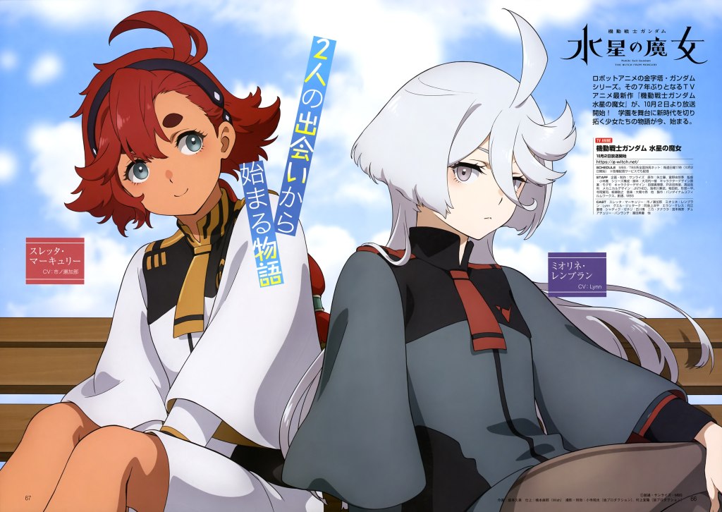 Mobile Suit Gundam: The Witch from Mercury is not on the front lines, and that’s the point. GWitch, as it’s colloquially known, is about business drama, high school, and yuri. Its central premise is an homage to Revolutionary Girl Utena: the show is about a series of high school duels where the winner gets to be the fiancè of an heiress. Like in Utena, it is a girl who ends up winning one of these duels: the titular Mercurian, Suletta Mercury.