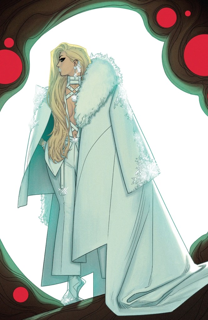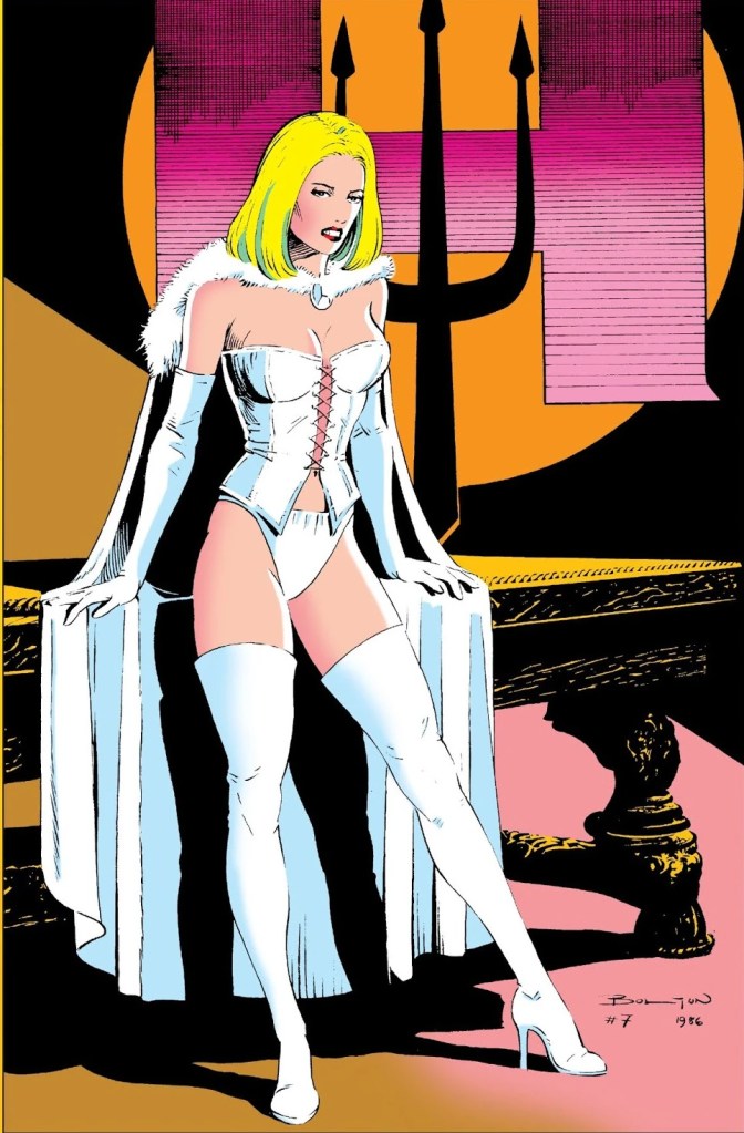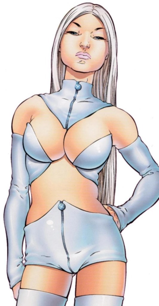 First: the design. That outfit. That f*ckass bob. She. Would. Never. And for two reasons: firstly, that it is simply not a serve, and secondly, because it misunderstands everything that is sexy about Emma Frost. An ugly leotard with bright blue accents and coattails? Not even remotely serving White Queen. Where’s the couture? The fur, the shoulder pads, the cape, the thigh-high boots, where’s the FASHION? All they do to make her sexy is give her giant Pixar-mom thighs and extra boob jiggle physics, and that’s just not Emma Frost. Her sex appeal has always been blatantly over-the-top, but in a way that reflects careful construction and deliberate presentation. When she first appeared with her corset, panties and fur cape, she presented unadulterated dominatrix. When she wore the completely illogical negative-space X-cutout outfit in New X-Men, it presented a version of sexy so over-the-top it can’t be read as anything other than intentionally self-aware.